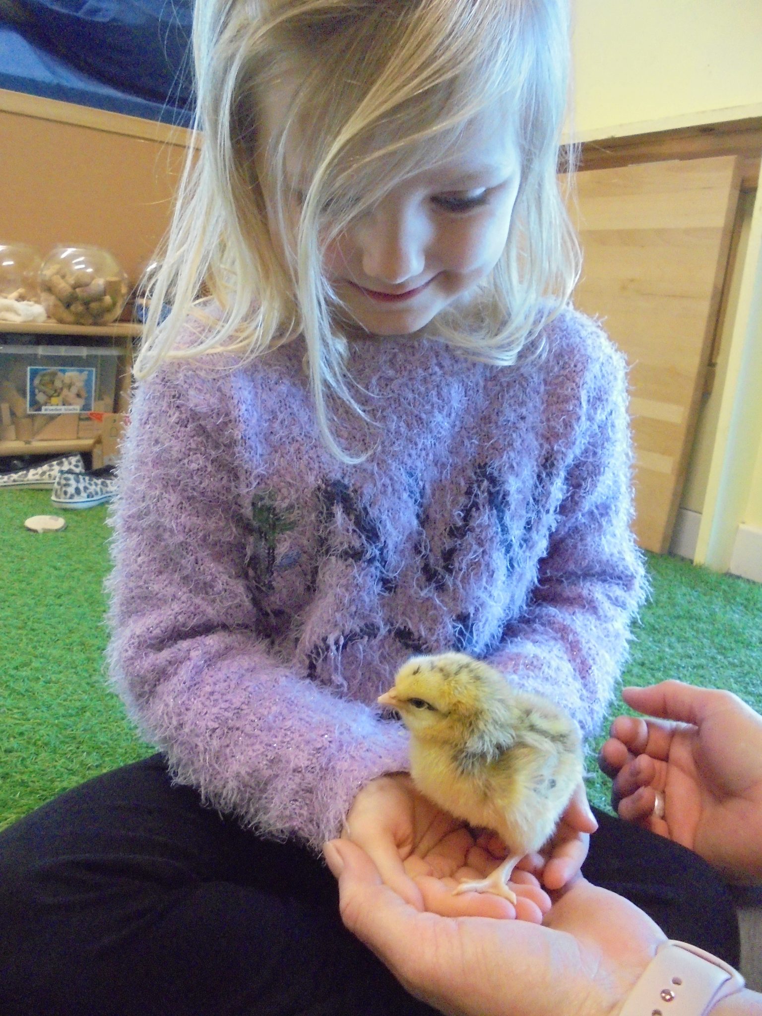 At Nursery, term 4 has been all about eggs and chicks. We started by learning the story Chicken Licken, which led the children to ask Niki to bring her chicks and hens to visit us at nursery. The children were so calm, careful and gentle with our visitors that we decided to incubate some eggs at nursery. We waited patiently and watched with excitement as three chicks hatched. We then spent the final two weeks of term looking after the chicks as they shed their soft fluffy down and grew their feathers.