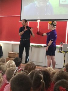 This morning, our week began by watching an assembly about indoor fireworks. Matthew Tosh is a Scientist and Radio Presenter who travels the world creating lots of exciting firework displays. In the assembly, he called Miss Offer to the front and she had to hold an exploding firework. Mr Chorley thought it was like a birthday candle without the cake! She had to wear a fireproof glove and protective screen over her face to keep her safe from the fire.